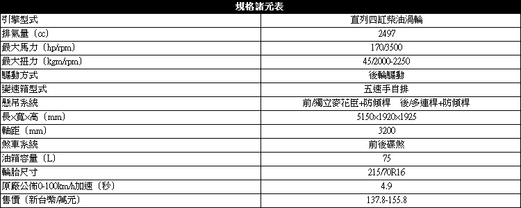 多人乘載不「腳軟」的2.5升柴油渦輪![]() ▲動力維持搭載2.5升柴油渦輪引擎。小改款後的Grand Starex動力上仍然維持搭載2.5升排氣量直列四缸柴油渦輪引擎,採用了可變幾何渦輪增壓技術搭配先進共軌燃油噴射科技,可輸出170hp/3600rpm最大馬力與45kgm/2000-2250rpm最大扭力,搭配五速手自排變速箱並採後輪驅動設定。 ![]() ▲五速手自排變速箱。雖然是有手動換檔功能的手自排變速箱,但其實平常應該不太會需要用上。齒比在三、四檔間似乎落差略大,刻意退檔有時會有明顯的引擎剎車頓挫。而在變換車倒要超車狀況下退檔也因柴油引擎轉速拉升較慢,反倒不如直接踩油門更快獲得加速力。 基本上,因為動力夠用,又何妨維持D檔享受輕鬆順暢的旅程呢?剎車制動力道的輸出在考量車內乘客舒適性之下,踏板的前段行程剎車力都是比較小、比較緩的,要踩到比較底時才比較煞得停車輛。這設定沒甚麼問題,但筆者個人認為踏板末段行程的制動力可調高一點,在應付一些突發需緊急剎車的情況下才不致來不及。