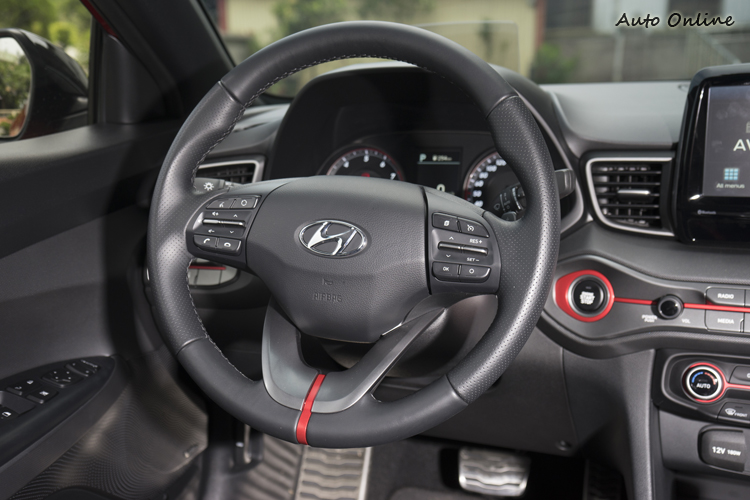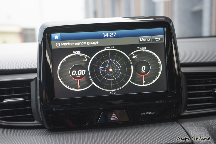中控台上配置八吋多媒體觸控螢幕可說是改款後的一大亮點,選單與圖形介面設計則與品牌其他新世代車款大致相同,看得出車廠在產品規劃上的策略。不過除了多媒體撥放、倒車顯影、通訊、Android Auto/Apple Carplay等功能外,因應Veloster的性能屬性系統還多出一項儀錶性能資訊顯示的功能,在畫面上以三圓錶形式顯示瞬間增壓值、G值與扭力輸出值/車速等在做激烈操駕時比較會在意的相關資訊。就像以前改裝族喜歡在中控台外裝三圓錶一樣,只是現在已經從類比轉到數位化時代,相信不少有改裝經驗的人都會有點感觸。