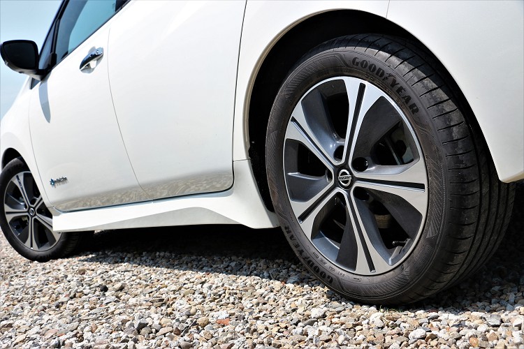 外型與一般車輛無異首先電動車在外觀不需要考量到前方引擎散熱等問題,所以能更講求空氣動力學。第二代Nissan Leaf不採大膽、前衛設計,取而代之是家族化特色,像是車頭V-Motion水箱護罩,結合專屬3D環保藍色冰塊造型飾板,以及造型新穎的LED頭燈,讓新一代Leaf車頭更具流線和科技感。先前有提到電動車沒有內燃機,如何降低風阻才是設計師首要工作,Leaf車身藉由模擬實際空氣流動環境進行空氣力學開發,垂直切削兼具導流和隔絕噪音設計的兩側車體,搭配具擾流功能尾翼,降低氣流阻力,減少風阻所造成的能源損耗。 ![]() ▲輪胎選擇在電動車尺寸內算大,搭配固特異電動車專用輪胎降低阻力增加行駛里程。![]() ▲與Tiida軸距相同為2700mm,Leaf整體外觀尺寸比起Tiida微微放大一點。![]() ▲前方充電插孔可分為交流電與直流電兩種,交流電的接頭適用大多數的停車場充電座,直流充電接頭則是Nissan專屬規格。![]() ▲要開啟前方充電孔的開關在駕駛者左側。