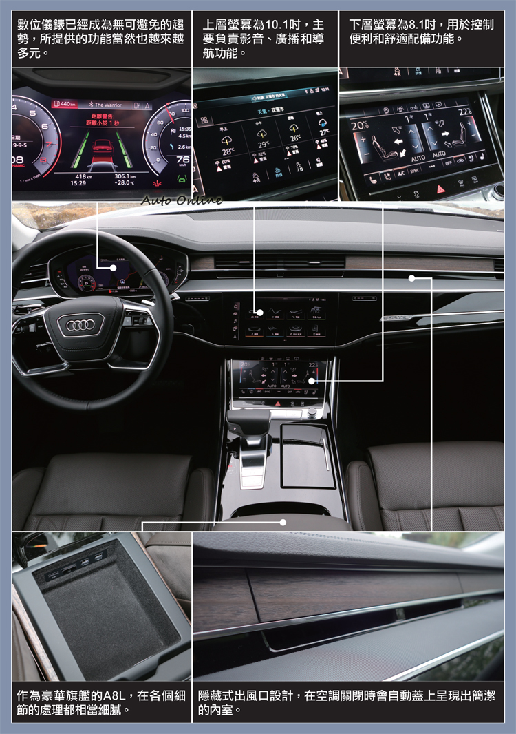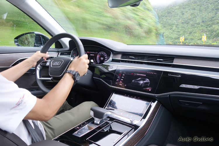 ![]() ▲包括ACC在內的公路行車輔助套件,讓駕駛過程更輕鬆、安心。試乘車多了全輪轉向系統的選配,搭配可變齒比的進階轉向系統,在開上金水公路後,完全展現出動態優勢。它的靈活性雖然比不上小型掀背車,不過軸距超過3.1公尺的A8L,這樣的表現比起一般中型車要好太多了,完全不是這個等級的車應有水準。當然開著老闆的代步車去殺彎是有點不像話,所以我們還是比較推崇它在劇烈加減速時,依然保有很高舒適性的特質,這方面就得感謝主動式氣壓懸吊的貢獻了。 ![]() ▲新一代A8L還搭載完整的主動安全科技,各種駕駛輔助和預警功能都相當完備。