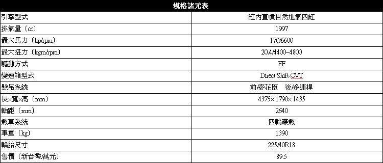 ![]() ▲動力依舊維持Dynamic Force 2.0L缸內直噴自然進氣引擎與Direct Shift-CVT無段變速系統。動力及底盤部分維持先前配置,TNGA底盤為前麥花臣、後多連桿,結合Dynamic Force 2.0L缸內直噴自然進氣引擎,可創造出最大馬力170ps/6600rpm與20.4kgm/4400~4800rpm最大扭力。變速箱則是Direct Shift-CVT無段變速系統,採用世界首創的Launch Gear技術。在使用更輕巧的鋼帶盤下,減少40%的旋轉慣性,搭配夾角更小的鋼帶盤設計,變速反應增加20%,油耗表現提升6%。手動模式下,電腦可模擬出十速的換檔邏輯,搭配有樂趣的底盤調校,犀利的轉向與後輪活潑的調性,穩定又能快速進出彎,馬力不大也能帶來愉悅的駕馭體驗。