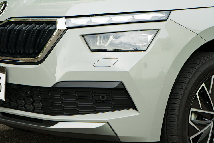 SKODA新世代的運動休旅車家族在外觀上都有著相同調性的共同元素,然後每部車再在這基本調性上去做細部的微變化。所謂的共同元素包含了兩道四邊形的日行燈、頭燈與霧燈、寬闊的水箱罩與寬度幾乎佔滿整個車頭、左右二側也帶著對稱矩形的前氣壩。有趣的是,Kodiaq與Koraq的頭燈與日行燈都是做在上方,下方為霧燈,而Kamiq則是將細長的日行燈做在上方、頭燈與霧燈做在下方。