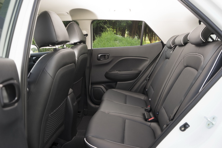 前座皮椅為全手動調整,椅背與椅墊都有一些側邊支撐,四周的白色縫線與個性化內飾搭配構成雙色調車室氛圍,也與雙色調的車身色相呼應。受限於是部小型車,後座以170公分左右一般身材成人乘坐的話小腿沒什麼向前伸展的空間,但就其軸距尺碼來看已經不錯了。頭部空間不管前後座都還不錯,不會像一些過於注重流線造型設計車款那樣被犧牲掉而帶給乘客壓迫感。