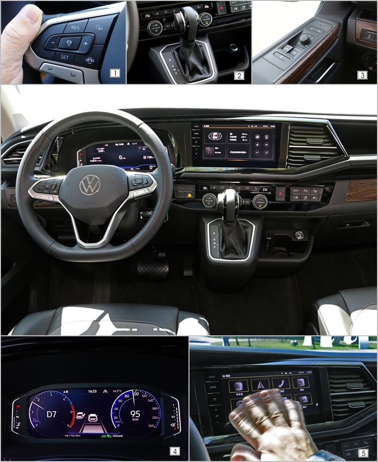 ▲(1)全速域ACC主動式車距調節巡航系統很容易使用,系統反應也頗為精準。(2)7速雙離合器自手排讓車輛在行駛間獲得相當高品質的換檔效率及舒適性。(3)木質飾板無論質感或是觸感都相當不錯,讓座艙多了幾分家居空間的溫度。(4)作為高級商旅車,當然少不了這套10.25吋全邏輯數位化儀錶板,不只功能齊全,畫面辨識度也更好。(5)新增的Discover Pro 9.2吋多媒體鏡面螢幕音響系統,不只支援智慧手機連線功能,還能直接以手勢操作。
