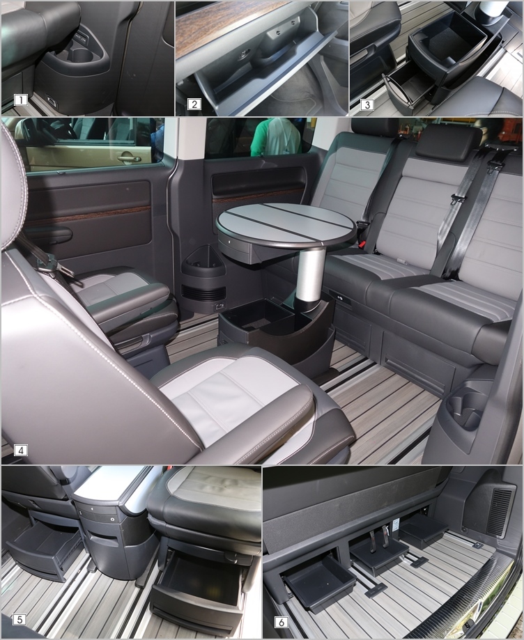 ▲(1)包括前後排座艙和行李廂,都提供多組的USB充電孔和12V電源插座。(2)由於其他地方提供相當多元的置物空間,手套廂空間大小就沒有那麼重要了。(3)折疊桌本身就藏滿了各式的置物格,還有兩套活動杯架可以使用。(4)後排可輕易調整成為小型會議室,成為本車最大特色之一。(5)+(6)第二、三排座椅下方提供隱藏式收納抽屜,不用擔心各種雜物沒地方放。