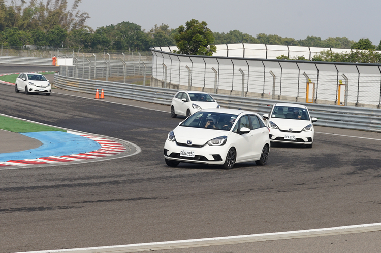 這次車廠安排了一天讓媒體在賽道上試駕,雖然以Fit的性能與產品設定來說猶如大池中的小魚。有的媒體還開玩笑說是在這個賽道中試過馬力最小的車。賽道試車共分為三道關卡,首先的直線加速/定點煞停測試中雖然起跑油門一拜到底,但「衝勁」就還好,與「貼背感」這個詞還是有段距離,之後馬達轉速拉高,扭力其實也只是往下滑,加上當天場地略濕的關係,所以大部分媒體跑出來的成績都在10秒左右。
