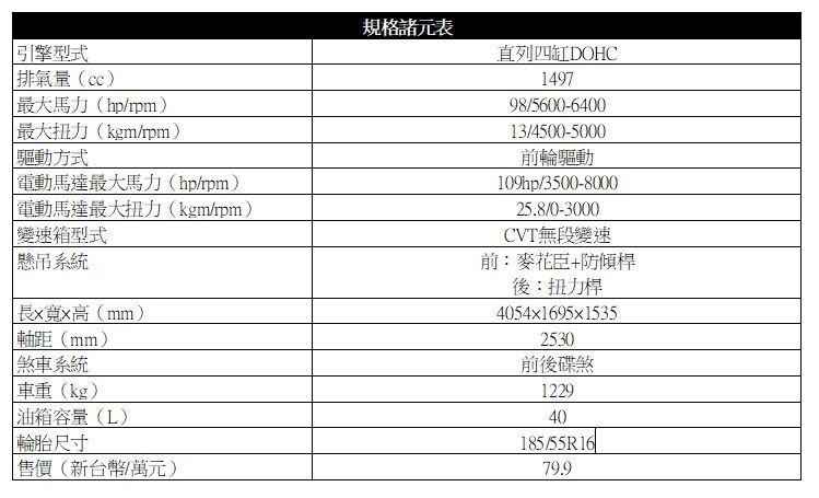 小體積的油電系統不僅節省機械空間,成本也相對一般油電系統更低,這點從車價只比1.5升汽油引擎車型貴五萬這點就可以大略看出。