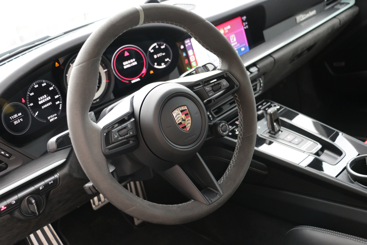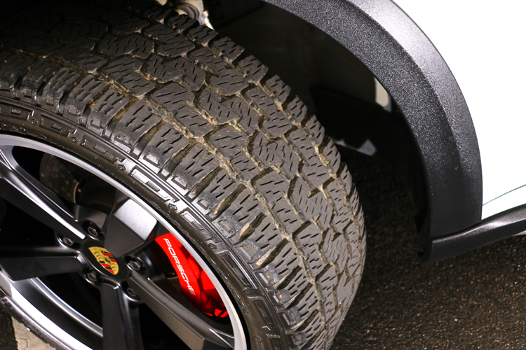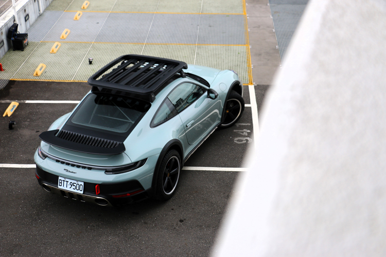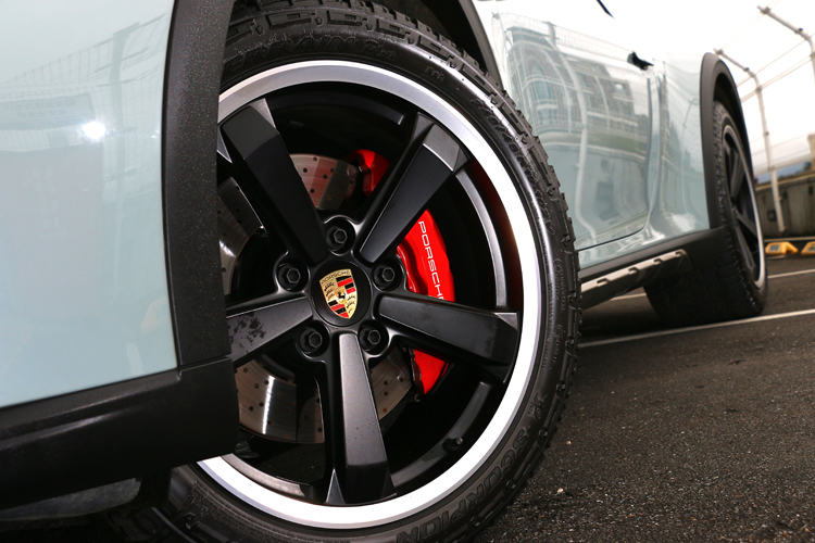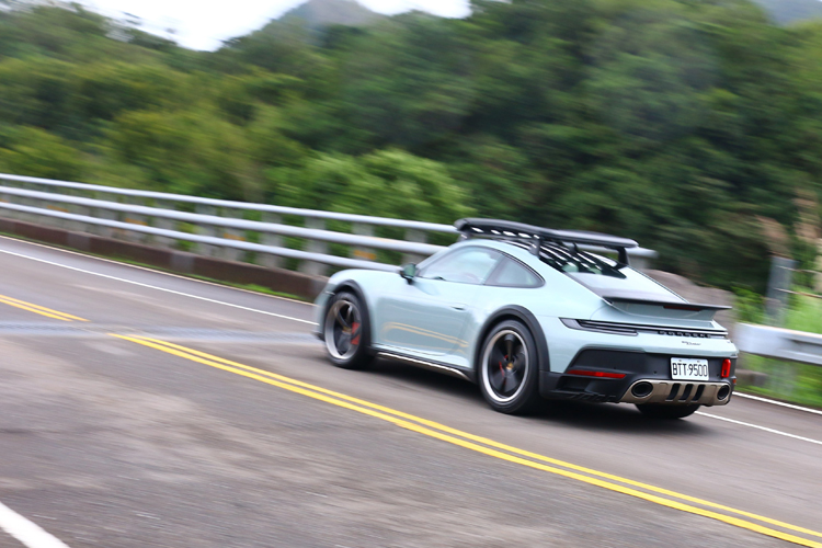 Porsche 911 Dakar底盤標準配備後軸轉向系統、GT3引擎腳、PDCC動態底盤控制系統、防傾穩定系統以及前述抬升系統等,開起來與一般的911差異類似,只是配上全地形輪胎,在鋪裝道路上的過彎極限受到影響,所以想要在賽道中刷成績也是可以,只是要換上一套性能輪胎。行車模式中有特殊的Rallye和Offroad兩種,在這兩個模式下電腦會自動把車輛身高,後者模式中更能額外增加高度,而且與正常配備氣壓懸吊車型相比,可以維持較高車身高度行駛較快的速度,不會因為速度太快又把車身高度回到正常狀態。除此之外,電腦也會自動偵測四輪驅動分配比例,確保四輪都能在沙地或者低摩擦路面上得到最佳抓地力。 ![]() ▲粗花紋輪胎放在911感覺相當特別,而且會影響鋪裝道路上的抓地力。![]() ▲Porsche 911 Dakar是一輛進出停車場不怕重傷底盤的跑車,特殊的反差造型得到搶眼關注度。