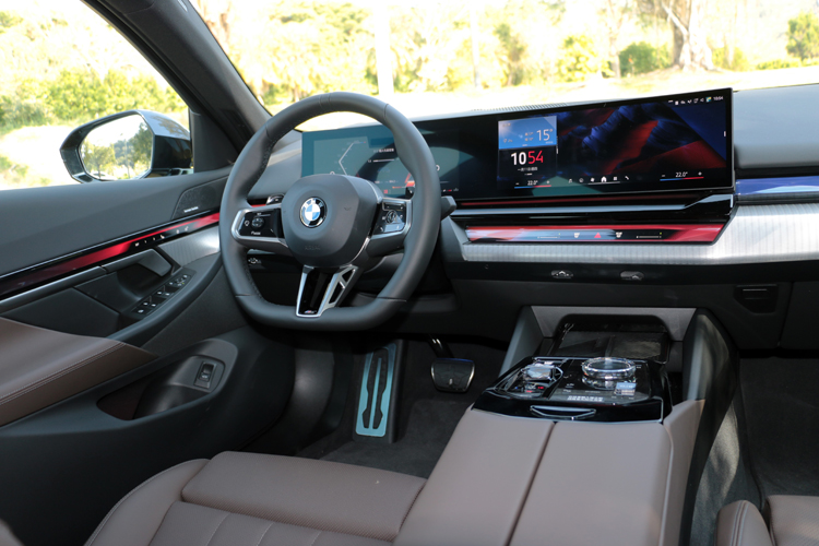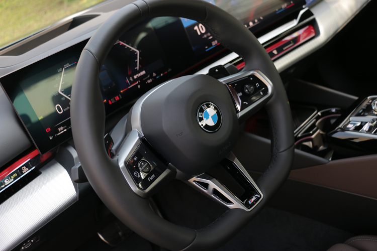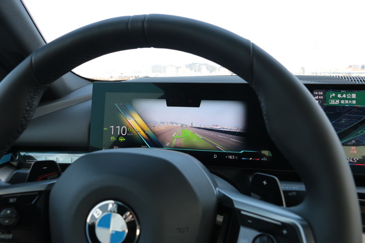 進到車內,整體的布局與造型,電車和油車沒有不同,只有配備上的差異。中控台最醒目就是12.3吋和14.9吋雙螢幕組成曲面螢幕,再結合環抱車室的BMW座艙環繞光幕,呈現出強烈科技感。影音介面採用BMW Operating System 8.5,導入了BMW首度採用的QuickSelect快捷選單與全新的Zero-layer概念,讓駕駛能以最直覺的圖像式邏輯進行操作。在i5上面,方向盤後方撥片只有一邊Boost加速功能,520i則是傳統的換檔撥片,長按左邊撥片一樣會進入Boost模式,引擎與變速箱有著最大出力。