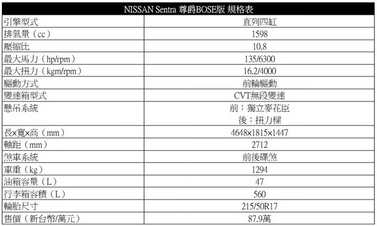 ![]() ▲座椅車廠強調對脊椎的支撐與分散身體乘坐時的壓力,實際乘坐時覺得坐墊比較沒有什麼回彈感,舒適度中等![]() ▲前座四周的置物空間,在中控台下方與前座中央置物盒各有2個USB插孔![]() ▲後座膝部空間還算OK,但頭部會略有侷限壓迫之感![]() ▲行李廂空間為560公升,不過空間形狀較不方正為影響到一些實用性![]() ▲i-KEY智慧鑰匙也在這次導入,靠近或離車時帶著鑰匙就會自動解鎖/上鎖Sentra這次小改,其實在安全相關部分的增加與強化上著墨不少。像是Auto Hold功能與電子駐煞車系統的導入降低長時間停車狀態(如大塞車)需維持用力踩煞車的疲勞及方便車主停駐車輛避免車輛滑動。 ![]() ▲Auto Hold功能導入,長時間停車就不用辛苦地持續踩住煞車![]() ▲AVM立體環景影像鏡頭畫素升至百萬畫素,並透過MOD提醒車主周圍有移動物體靠近![]() ▲按下左側視窗不同區域就可切換至不同視角,而滑動右側視窗車輛模型也可轉換不同視角![]() ▲導入LKA之下,現在可以用Lv2半自動駕駛讓行車過程更輕鬆這次小改款在動力與底盤懸吊上都沒有變動,儘管所搭載代號「HR16 K2」的1.6升直列四缸自然進氣汽油引擎改款前的最大馬力與扭力數據為138hp/6300rpm、17.2kgm/4000rpm,新Sentra的數據則為135hp/6300rpm、16.2kgm/4000rpm,有著微妙的差異(可能跟滿足油耗表現有關),但對於整體性能表現來說則沒有影響,對於一般家庭通勤代步、出遊都算是夠用。懸吊設定是以偏重舒適性為主,對於一些路面小坑洞與碎震也有不錯抑制效果。遇到較大的坑洞或路面高低起伏時車身才會有較多的跳動。 ![]() ▲動力部分維持搭載1.6升自然進氣引擎![]() ▲變速箱也是維持搭配X-CVT無段自動變速系統