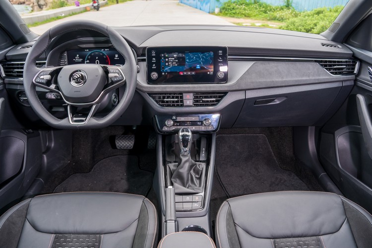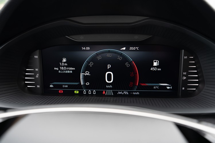 車內是這次Scala小改著墨最多也最有誠意的地方,例如改款前讓人覺得非常「傳統」的兩大兩小圓類比儀錶板現在換成了之前我們在Karoq所看到的那套10.25吋全彩數位儀錶螢幕(兩側的燃油殘量與水溫表不在樹為儀錶畫面範圍),畫面圖形設計與風格也都相同,算是清楚俐落,中規中矩但就略失一點活潑生動化之類的獨特感。
