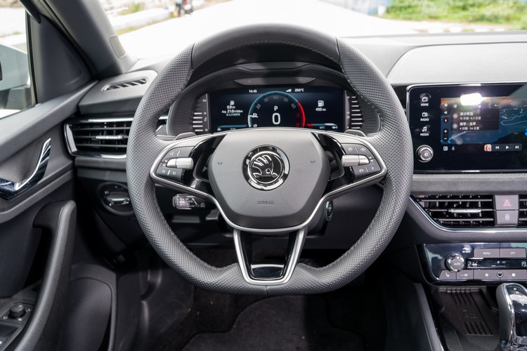 既然數位儀錶與Karoq是同一套,那莫非....。沒錯,駕駛者前方的三輻跑車式平底真皮多功能方向盤也與Karoq相同。左側的按鍵與旋鈕用來控制媒體、音量與聲控,右側則是控制Travel Assist、ACC與儀錶畫面切換功能。