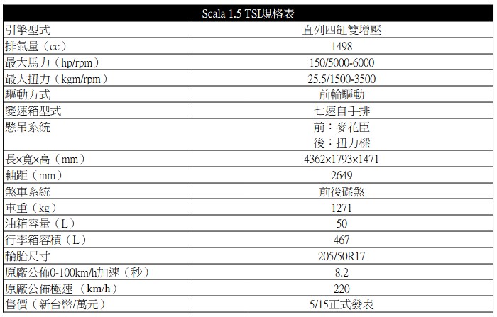 Scala改款後的動力陣容不變,仍是1.0 TSI與1.5 TSI兩汽油渦輪引擎選項。這次試駕的豪華菁英版車型所搭載的1.5 TSI EVO2直列四缸汽油渦輪引擎動力輸出也與改款前相同為150hp/5000-6000rpm最大馬力與25.5kgm/1500-3500rpm最大扭力,搭配DSG七速自手排變速箱,