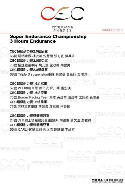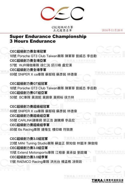 台灣屏東大鵬灣賽車場首次舉辦超過一小時的耐久賽,可以算是2016年賽車比賽中最大盛事。CEC超級耐力錦標賽是由中國廣東國際賽車場單位所舉辦,此次特別來台灣舉行三小時的台北分站,參賽車輛30輛車、車手接近百位,經過漫長的三小時,比賽就在大雨中圓滿落幕。