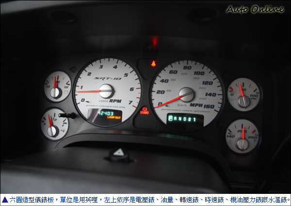 DODGE Ram SRT-10在變速箱上有4速自排跟6速手排可以選擇,試駕車款為4速自排設定,4速變速箱在一台500多匹馬力的性能車款上感覺有點不搭,檔位較少所以在齒比配置上無法搭配完美,實際100km巡航4檔轉速落在2000rpm左右,如果能選擇6速手排車款想必馬力輸出感受更為顯著。大馬力車會跑也要停得下來,小編看來看去覺得它的煞車是它最薄弱的一環,380mm碟盤尺寸搭配四活塞卡鉗,後面單邊雙活塞配350mm碟盤,低速行駛夠用但常維持高速奔馳的DODGE Ram SRT-10來說提升為前六活塞後四活塞比較保險。
