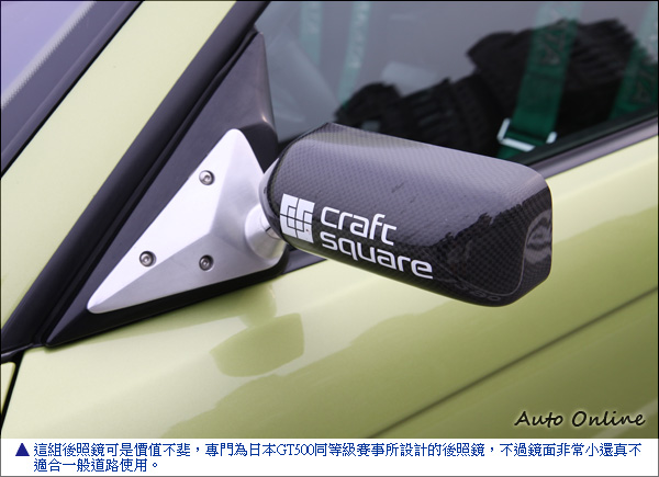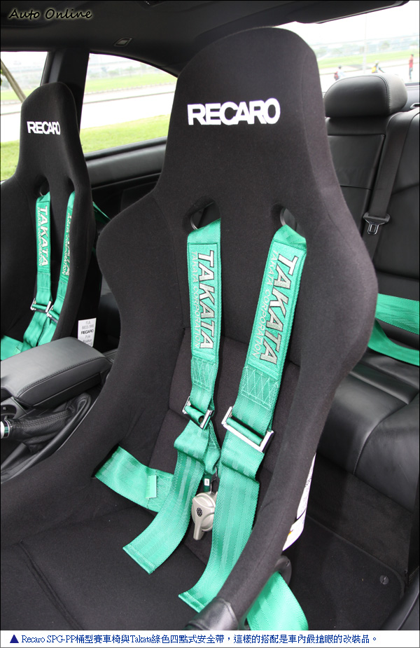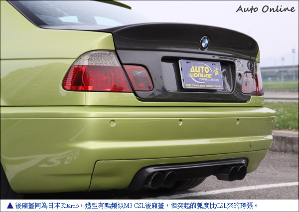 Nurburgring特仕車塗裝 就差寬體上身![]() ▲日本Kitamo碳纖維引擎蓋兩側有碳纖維散熱孔,但只有散熱孔留著碳纖維色澤,為了避免在高速有引擎蓋彈起還加裝安全扣。車主小戴的愛車在受訪前幾個禮拜才剛從烤漆廠出來,特殊的顏色塗裝是小戴心目中一部德國Nurburgring最速E46 M3相同的車色,特地拿照片給烤漆廠調出的特殊顏色,綠色中加入黃色在不同角度會有不同反射效果。這台車不但動力兇猛外,外觀也是它的特色之一。前大包為M3 CSL原廠品,左右兩邊有碳纖維下擾流,日本Kitamo碳纖維引擎蓋兩側有碳纖維散熱孔,但因為怕在路上太招搖所以特別同車色處理,只有散熱孔留著碳纖維色澤。德國車用日本改裝品很怕密合度不夠,不過Kitamo引擎蓋跟葉子板縫隙有如原廠讓車主很滿意。
