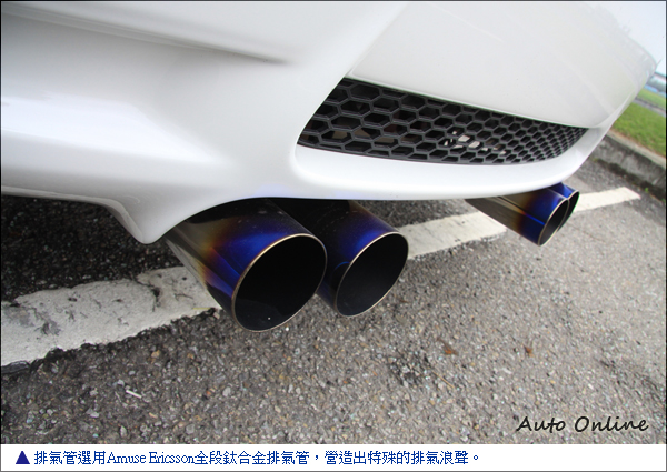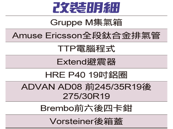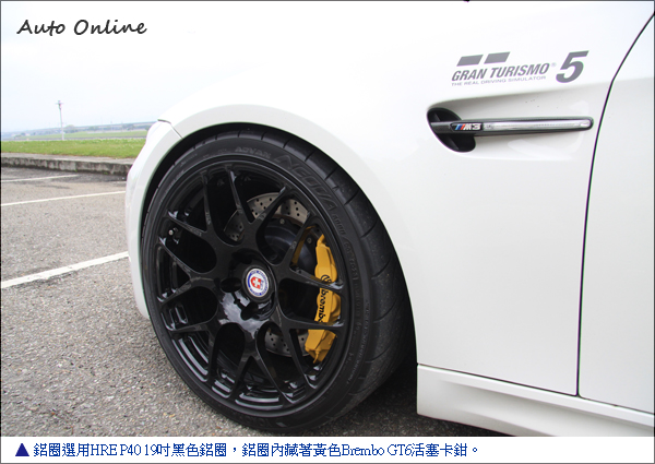 ![]() ▲白色車色搭配黑色鋁圈已經成為一種潮流。鋁圈選用HRE P40 19吋黑色鋁圈,白色車身搭配黑色鋁圈成功吸引路人目光。鋁圈內藏著Brembo GT前面6活塞卡鉗後面4活塞卡鉗,車主選擇亮眼的黃色,在黑色鋁圈內格外搶眼。碟盤尺寸為前380mm浮動式碟盤跟後面同尺寸380mm一體式標準碟盤。強大的制動力有助於車主在山路上激駕,並且可以用較晚的煞車點超越對手。輪胎用時下最夯的ADVAN AD08,前245/35R19、後275/30R19輪胎尺寸規格。