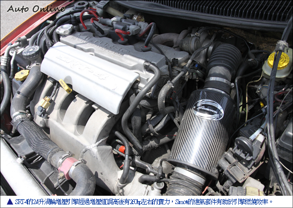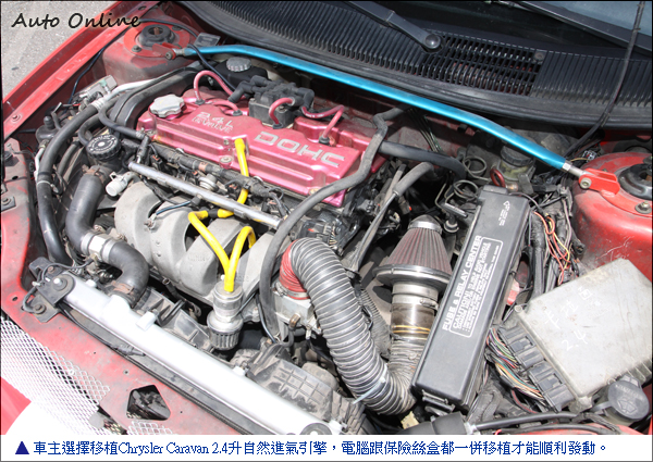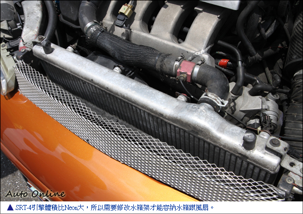 2.4升Caravan引擎移植 外表重新烤漆會更美除了改裝引擎進排氣外,移植整顆引擎是另外一種選擇。車主選擇移植Chrysler Caravan 2.4升自然進氣引擎,移植這顆2.4升引擎比起SRT-4簡單多了!引擎腳位跟原本位置相同,不需要再另外手工修改,變速箱沿用原本Neon的三速自排。引擎線組無法共用,也是經過Tuner手工修改,移植Caravan的電腦跟保險絲盒才能順利發動。在更換引擎的同時車主也順便做了進排氣升級,引擎動力提升後怕原本的散熱系統無法負荷,改裝鋁製加大水箱跟變速箱油冷卻器,良好的冷卻系統是確保引擎耐用度的重要因素之一。