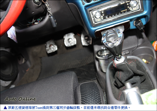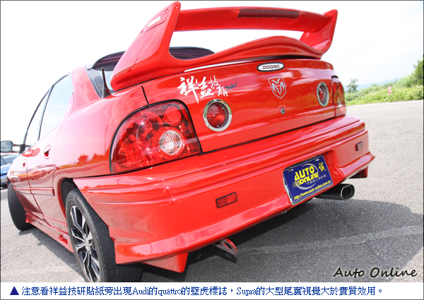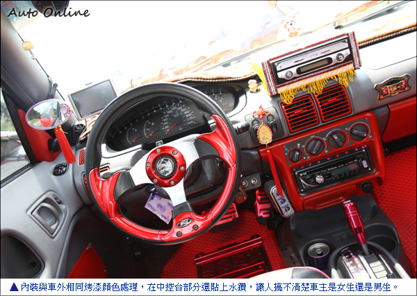 視覺系改裝 閃亮亮車內裝飾![]() ▲法拉利紅的車色搭配W型車身大包,電鍍M3水滴型後照鏡,讓粗曠的美系車也可以很日系。名為毆吉桑的車主比較注重視覺系的改裝,車身顏色選擇法拉利紅,前後改裝W大包套件,側裙從喜美K8修改而來,大型的Toyota Supra尾翼視覺效果大於實質效用,電鍍與黑色塗裝的十輻式鋁圈,M3水滴電鍍後視鏡,讓美系的Neon也可以走日系VIP風格。中控台、儀錶板透過車主巧手施作跟車漆相同顏色,在冷氣跟音響面板上貼上水鑽,讓人搞不清楚車主是男生還是女生。平常不開快車的歐吉桑,很注重車內音響品質,中控台上方自行加裝伸縮螢幕,高檔的真空管音響還可以在車上唱卡拉OK,享受在車上的優閒時光。