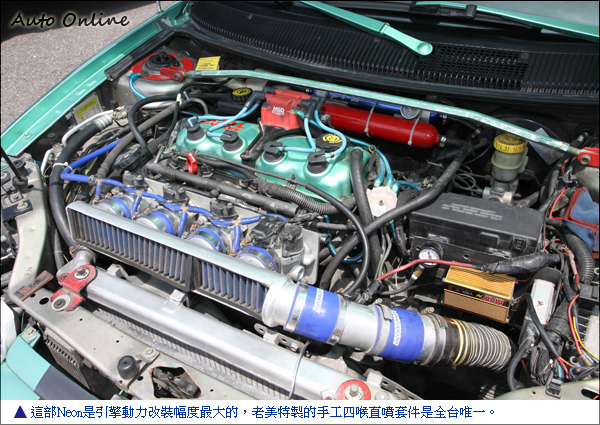 車色無關政治 Na一拜是車主目標![]() ▲別看到綠色就以為政治黨派偏向哪一方,車主表示他選擇綠色純粹是因為喜歡。這台綠色的Neon是車主阿竹的愛車,不要看到綠色就以為他是民進黨的,他只是單純喜歡綠色而已。阿竹是動力取向份子,自己從美國引擎Neon改裝套件的費用超過30萬,Na一拜是他的目標。引擎部分改裝幅度很大,最有特色的是跟老美購買手工四喉直噴套件,但說穿了只是利用鋁製岐管加上四個節氣門;車主阿竹還自己手工製作集氣罩,有雨天跟晴天兩種變化模式。