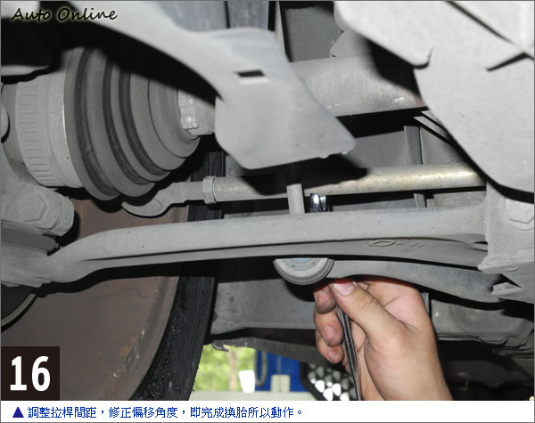 若你是一次將四只輪胎全數替換掉,通常換胎店家還會附贈一次四輪定位。雖然你可以看到店家將輪胎開上定位台,不過有些只會用定位台上的前束校正板,概略的看看你車輛是否有Toe in或Toe out的現象。也店家會開啟定位電腦,透過雷射掃描精準判斷Toe in或Toe out的偏移角度,再來調整懸吊拉桿,調整回輪胎無偏移的角度。