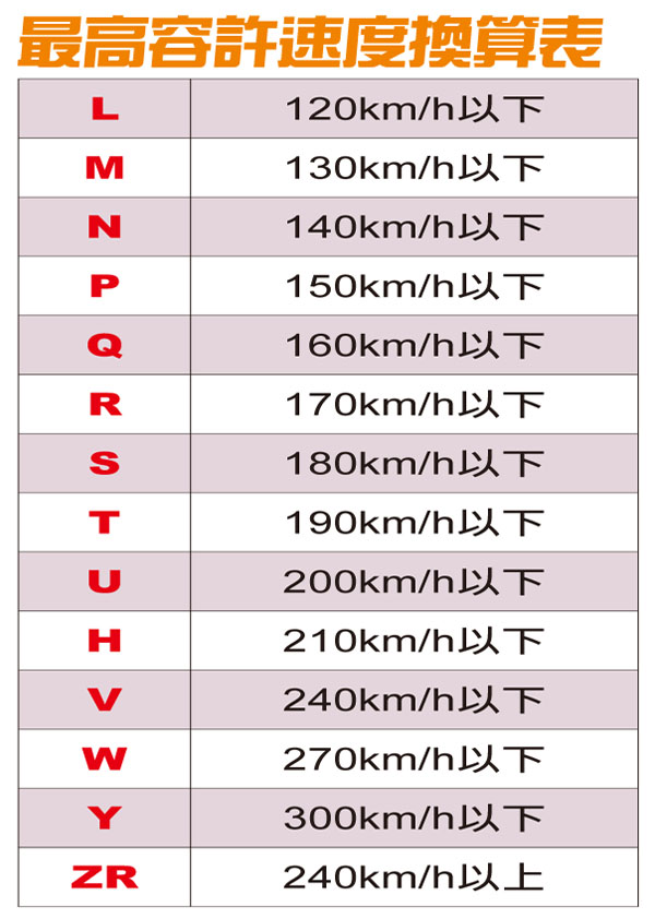以前夾雜在輪胎尺碼標示裡的最高容許速度,現已經獨立出來與負載指數並在一起,以圖示的88H為例,88表示單輪最大的載重指數,代表著一個輪胎可以承受最多至560kg的重量;H則是輪胎的最高容許速度,代表這輪胎被允許在210km/h以內的時速下工作。有些輪胎他的單輪最大載重公斤數,被直接標示在胎壁上,與最大充氣磅數圈在一起,不必透過換算即一目了然。