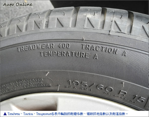 在瞭解正規的輪胎標示後,還有些標示攸關著則你我對輪胎的選擇,也是需要來瞭解一下。每一款輪胎各有其不同的輪胎特性,有些較為耐磨、有些則偏向抓地力的表現,但這要如何從輪胎上看出一二呢?翻轉一下輪胎,你將會看到Treadwear、Traction、Temperature三組數值,Treadwear表示耐磨係數,數字愈高表示愈耐磨;Traction表示輪胎的循跡抓地指數,A級代表最佳,B級、C級則遞減;Temperature則表示著輪胎的耐溫指數,同樣的也是A級為最佳,B級、C級遞減之。