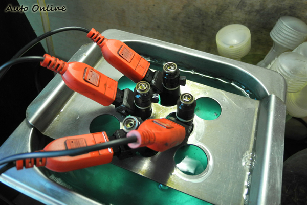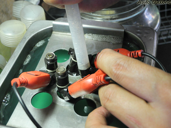 STEP 2將噴油嘴置入放有工業用超音波清洗藥水的清洗台內,並利用工具導出空氣,使藥水得以流入噴油嘴,以利超音波震盪。