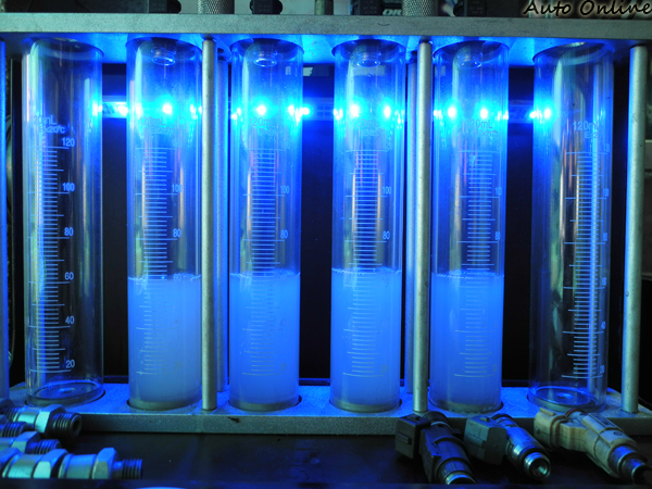 清洗後的效果![]() ▲看看清洗前與清洗後的洗劑,就可知道你愛車的噴油嘴是有多麼的髒了。噴油嘴在清洗之前,廠商已經先行測試了噴油嘴的工作狀態,經過分別代表各缸噴油嘴的標示後,很容易的即可知道哪知噴油嘴工作狀態是有問題的;清洗後再裝上測試台測試,即可明顯的看出清洗後的噴油嘴其各缸噴射流量是比較趨近一致的。 ![]() ▲清洗前的噴油嘴其供油量接近60㏄,唯左側第一支噴油嘴工作狀態最差。![]() ▲清洗後的噴油嘴其供油量已經足有60㏄,左側第一支仍是不足60㏄,可判定該噴油嘴已有故障的跡象。![]() ▲透過透明試管還可看出噴油嘴工作的霧化效果、噴射力道、噴射流量以及噴射是否順暢,來判斷噴油嘴的狀態。清洗過後,在噴油嘴作動正常的情況下,引擎工作的燃燒效率會變得更好,當然連帶引擎的動力輸出也會回到原本該有的動力表現,讓你的愛車回復到新車般的動力水準。