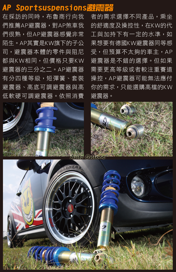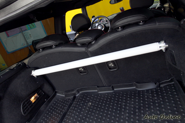 ![]() ▲為了慶祝Morris Mini Traveller誕生50周年之際,Mini推出以英國氣質典雅近郊Hampton為名的Mini Clubman Hampton特仕車。50周年紀念版的Mini Clubman Hampton Cooper S,在動力與操控全面提升後,有著不一樣的操駕樂趣,這就是改裝的真諦所在。油門輕踩與原廠動力幾乎相同,不會感覺不易上手;當駕駛重踩油門,瞬間的動力輸出直覺就是要抓緊方向盤,Tuner表示目前最大馬力大概在220hp左右,與原廠的184hp相比提升不少,0~100km/h加速初估再6秒多。 ![]() ▲布魯商行自行開發的前後上拉桿,明顯的白色塗裝突兀就見仁見智。![]() ▲布魯從車主做起,所以對Mini非常熟悉,布魯商行引進各式Mini改裝部品供消費者選擇。