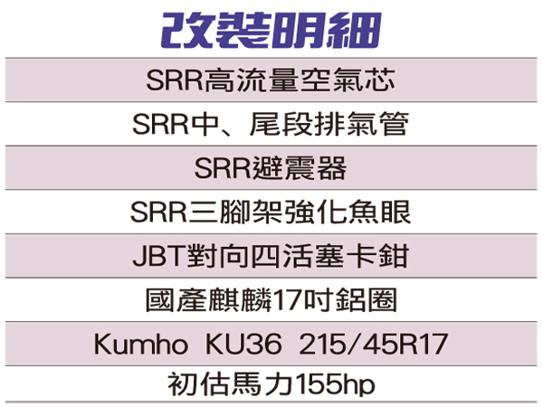 底盤強化第一優先![]() ▲目前只針對Elantra做底盤的強化,如果能克服電腦程式的對應,相信接下來會出現怪獸等級的Elantra也不意外。Tuner購入新車之後,首先針對Elantra底盤做強化。第一步先將支撐性不足的避震器換掉,換上SRR高底軟硬可調避震器,這組避震器針對Elantra的車重做桶身阻尼的重新設計,避免僅有1,255kg的車重過於彈跳;阻尼有30段的調整,可以隨著賽道或者道路做不同設定;車高則是可以做無限段數調整,想要降低到藏輪都可以辦到,目前車高設定在前、後一指幅左右。 ![]() ▲內裝維持原廠式樣,接下來會不會出現賽車方向盤跟賽車椅,就讓我們繼續看下去。![]() ▲內裝唯一的改裝品就是油門、煞車金屬踏板。![]() ▲Tuner將原廠16吋鋁圈換上國產麒麟17吋鋁圈,瞬間提升Elantra的帥氣度;輪圈內改裝國產品牌的JBT對象四活塞煞車。