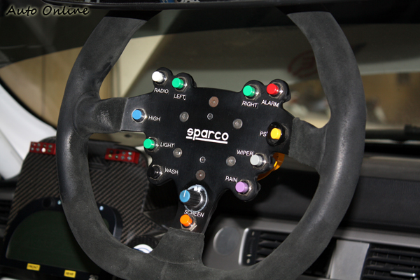 ![]() ▲冷氣以及音響面板被碳纖維飾板取代,上面有車輛電子配備的指示燈。內裝早已全部拆光,裝上符合FIA規格的防滾架,WTCC世界房車錦標賽規定,必須保留原車的中控台,所以車內還是看的見BMW 320i的中控台,不過只保留冷氣出風口以上的造型,冷氣以及音響面板被碳纖維飾板取代,上面有車輛電子配備的指示燈,告訴駕駛那些東西是被開啟,哪些是關閉的。 ![]() ▲大耳朵的RECARO賽車椅,將車手牢牢固定在椅子上,發生撞擊時能確保車手有完善安全保護。![]() ▲Sparco方向盤上有較為重要的控制開關,像是燈光、雨刷、無線電、玻璃加熱除霧的開關。![]() ▲除了車內的安全配備以外,車手安全人身部品攸關事故發生能否全身而退。