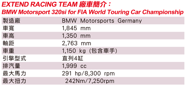 BMW Motorsport 320si![]() 這輛由E90為基礎的比賽車,是經由德國BMW MotorSport賽車部門所打造,車輛所有的配備都經過FIA認證,也就是說這輛車可以直接下場參加國際世界房車的賽事。其實再購入這輛BMW 320si WTCC賽車之前也有考慮過Chevrolet WTCC賽車,不過礙於台灣沒有販售Chevrolet品牌車輛,如果後續藉由比賽開發套件,Chevrolet在台灣完全沒市場,所以最後還是考慮BMW 320si WTCC;另外,後輪驅動的BMW 320si WTCC,也比前輪驅動的Chevrolet WTCC賽車來的有樂趣。 ![]() ▲從這角度看,很明顯發現這輛BMW Motorsport 320si WTCC前葉子板寬度比起一般正常E90 320i寬很多。![]() ▲車尾的GT尾翼增加比賽時後輪的下壓力,排氣管位置重新設計,改為雙出尾段。![]() ▲全平面的光頭胎提供車輛很高的過彎極限,價格不斐考驗車隊的口袋深度。