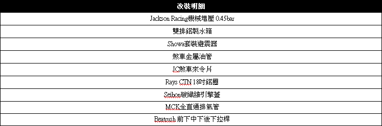 ![]() ▲加大雙排鋁製水箱提升冷卻效率,增加引擎耐用度。在現有的引擎室空間增加機械增壓套件,相對會影響到原廠所設計的散熱功能,要確保經過升級之後的CR-Z有好的耐用度,Tuner將原廠水箱更換為雙排鋁製水箱,提升冷卻水的散熱效率, ![]() ▲Seibon美國品牌,專門設計製造碳纖維車身鈑件,散熱鰭能快速排出引擎室內的熱氣。![]() ▲底盤為了要能應付提升後的動力,換上Showa套裝避震器。![]() ▲Rays CTN 18吋鋁圈搭配225/40R18普利司通性能胎,抓地力表現一流。![]() ▲台灣之光MCK排氣管,Tuner刻意將尾管隱藏在保桿內,避免不必要的關愛。