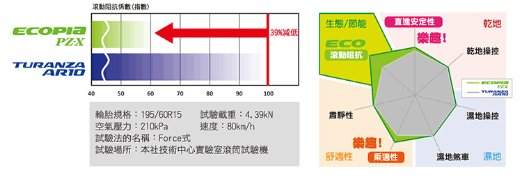 根據業者內部的測試結果,新的ECOPIA PZ-X和舊有商品TURANZA AR10相比,節省油耗方面就進步了12.4%,換句話說,如果一年用掉1500公升的汽油,換裝ECOPIA PZ-X後每年就可能省下186公升,也就是抵銷將近兩條胎的花費!這等於是每兩年就省一套胎,實在很驚人。