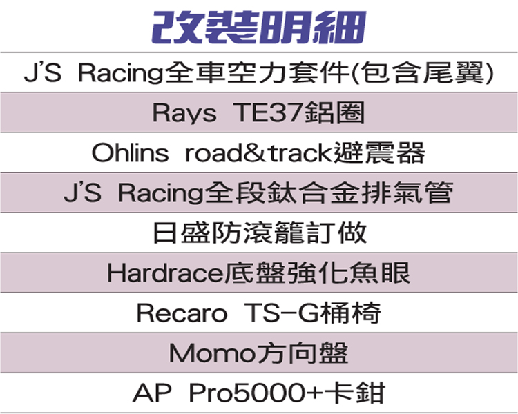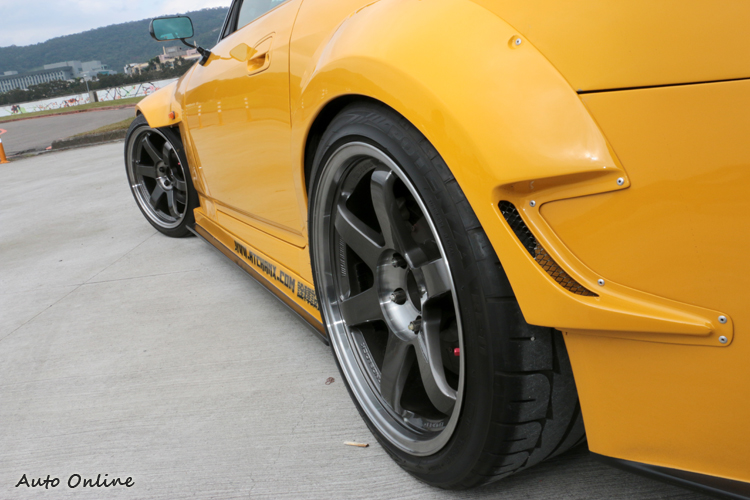 外觀J’S Racing MK2空力套件,套件包含前後保險桿、引擎蓋、前葉子板、後外擴輪拱以及碳纖維尾翼,最有特色的是後外擴輪拱,他的固定方式是在原廠板件外鑽洞以鉚釘固定,外觀很明顯可以看出是外加板件,加寬板件後能容納更寬輪胎尺寸。
