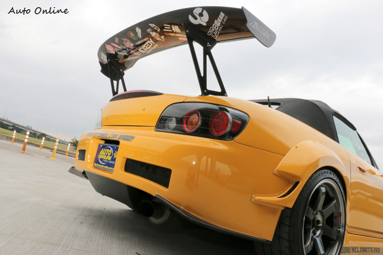 ▲J’S Racing高聳的尾翼增加車尾下壓力,車主將改裝品牌贊助貼紙,貼在尾翼下方。