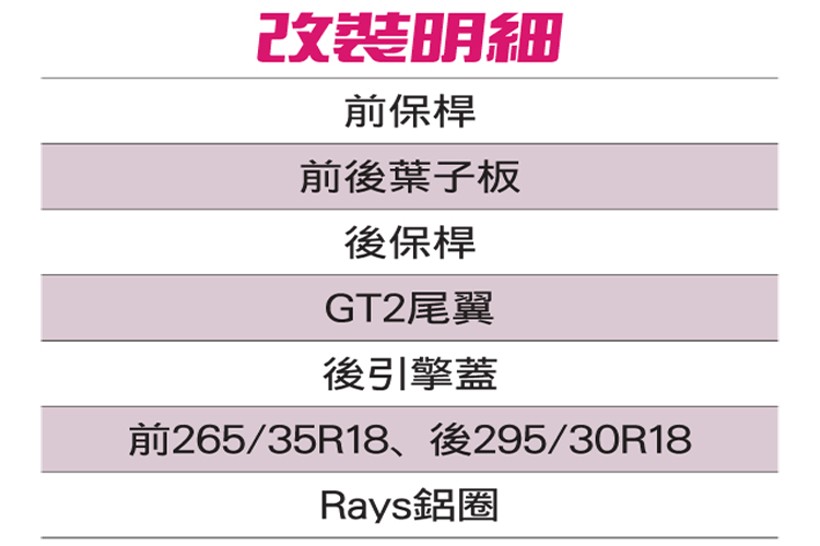 鋁圈為了要配合空力套件,前輪升級到265/35R18、後為295/30R18;鋁圈使用Rays改裝部品,輪面剛好與車身切齊,完整度非常高。