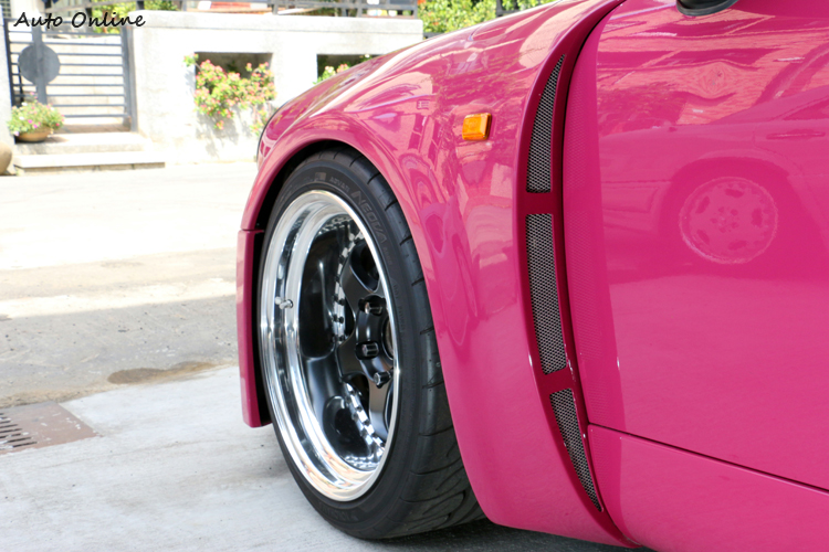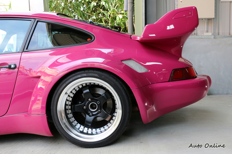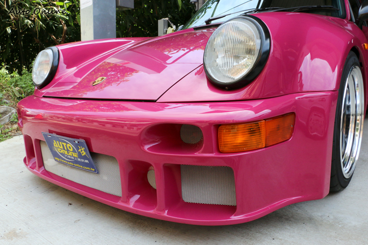 顏色搶眼的粉紅色保時捷964剛從日本運抵台灣,原隼國際的傅哥力邀我們前去採訪,不過車輛目前還未取得正式牌照,所以只能靜態拍攝以及車庫前方空地移移車。看到粉紅豹(我給它的稱號)的第一瞬間,如同之前採訪過的橘色RWB 993,被他非常誇張的前後輪弧給震撼,老保時捷居然可以如此美麗。拍照的同時,傅哥湊上來說,外觀與RWB有些類似,但是你可以發現鈑件固定方式差異很大。確實Sunburst 964誇張的外擴鈑件外部看不到任何鎖孔,就向原廠車輛出廠時所裝設。不過我覺得沒有螺絲鎖點雖然看起來簡潔,不過視覺上就沒有RWB來的有張力。