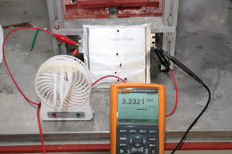 ▲測試過程中發動的電芯受到外力穿刺或者浸泡水中,電力依舊不減並持續運作。
