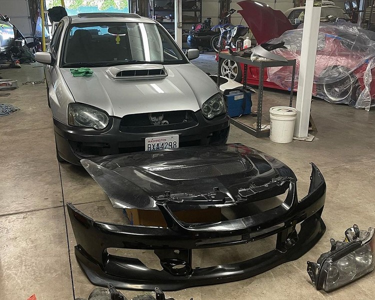首先Jonah選擇了一輛2005年Impreza WRX作為改裝出發點,並買了EVO的引擎蓋、前保桿與葉子板回來手工組裝。要成功的移植EVO車頭其實不適太難,但要如何做的完美、不突兀,考驗著施作者功力。首先是引擎蓋,幾乎可與WRX匹配,不過絞鍊周圍部分必須經過補強。再來就是EVO大燈尺寸WRX完全不同,所以要切除元角座進行手工焊接,而且原配置在燈殼後方的WRX ABS系統必須廢除或者搬移至其他地方。最後就是EVO的前葉子板比WRX還寬,這意味著葉子板必須經過修改,Jonah聰明的將兩車葉子板合而為一,才可以完美的將葉子板邊緣與前門接合。