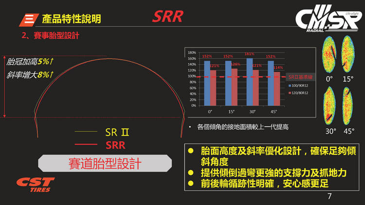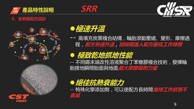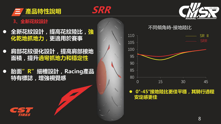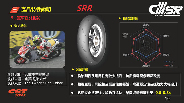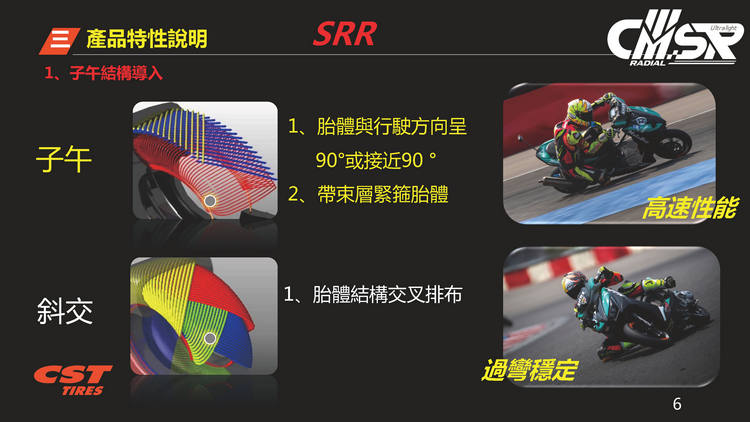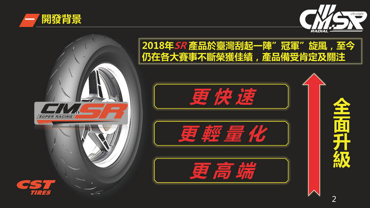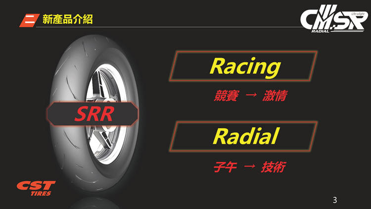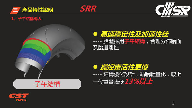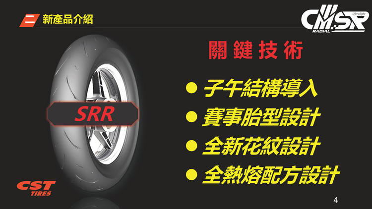 2017年發表第一代的CMSR十二吋競技胎,經過多年醞釀推出全新一代的CMSRR,規格為100/90R12、120/80R12。單一輪胎胎體輕量化達500公克,新舊款胎款的重量差異達13%,試圖在極度輕量化與操控性方面取得平衡點,帶給騎士全新的操駕體驗。