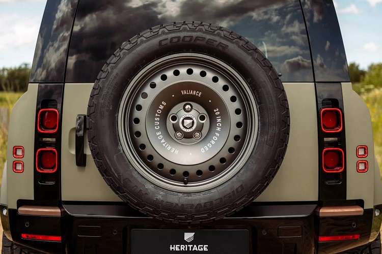 這顆名為Rock Dust的鍛造鋁圈設計靈感其實來自於Land Rover原廠鐵圈,只是尺寸更大來到20吋,剛好把輪弧塞滿,相當有視覺張力。鋁圈的顏色有白色、黑色以及青銅色三種可選擇。鋁圈表面採用經典的多孔設計,中央表面上標示著Heritage Custom、Valiance、20-Inch Forged。