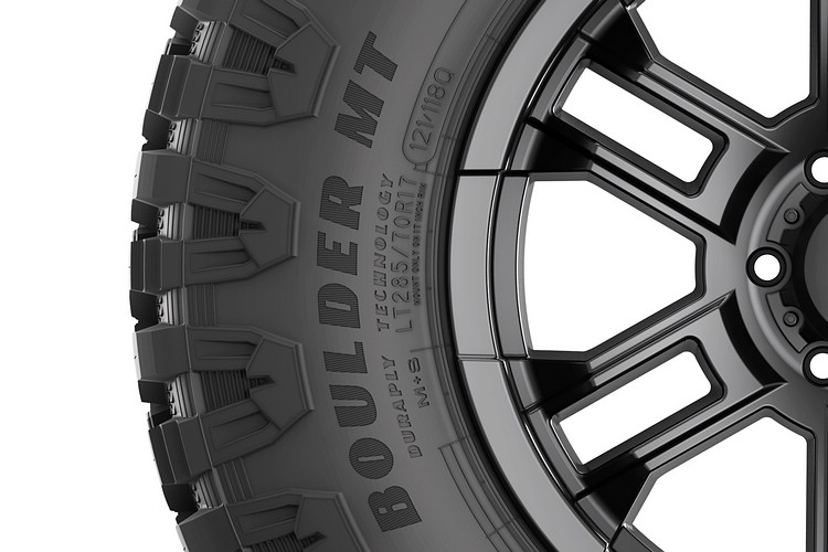 Wrangler Boulder MT是一款適用於各型SUV或皮卡的越野胎款,共有17種規格可供選擇,外徑從31吋至37吋不等。這款輪胎主要特色包括採用更大膽的肩部設計,以及大型胎塊花紋,以提供輪胎在困難地形移動時所需的抓地力。加寬的胎溝則有效避免碎石卡進縫隙影響抓地或排水,同時還導入Duraply技術,讓側壁與胎面在征服跨越障礙時避免受損。