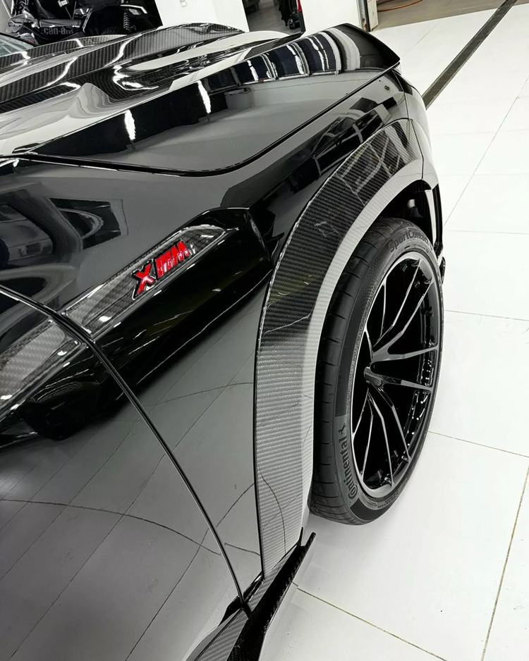 第二個版本就顯得有些神秘,車身全黑色討漆處理,搭配上裸露的碳纖維車身套件。首先,該套件在引擎蓋上有一組附加組件,突出的鈑件得到非常誇張視覺效果。此外,與第一版車型最大不同處,前者保留原原廠規格鋁圈,黑色則配備一套全新23吋十輻設計鋁圈,裡面則有紅色多活塞卡鉗。為了將所有配備完美協調融合在一起,每輛XM標誌都有大膽紅色調,與車內紅色皮革相互輝映。