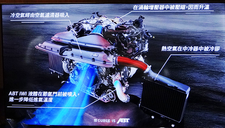 這是ABT透過IWI(間接水、乙醇噴射系統)才能達成的成就。IWI的作用原理是將水和乙醇混合液霧化後,噴入雙節氣門之前的進氣道,在ECU精準控制下,降低燃燒室溫度以提升強制進氣系統的效率,同時具有抑制爆震、提升空氣密度的效果,讓引擎在高負荷下依然能釋放最大性能。