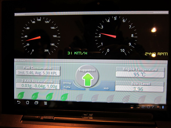 此外透過衛星訊號的連結,電腦會將相關的油耗成績回送給後台,後台頁面詳細記載不同車輛的油耗排名,也可比賽看看那台車最不省油等等,可提供如計程車車隊或貨運業者掌握駕駛的油耗,降低開銷成本。而為因應怠速超過三分鐘必須要受罰的新規定,這台機器也會藉由動畫來提醒駕駛怠速是否超過三分鐘。工研院表示這套系統的擴充性很強,也可按照不同的需求設計專屬的顯示介面,未來也可整合如胎壓或機油溫度等資訊,透過藍芽可直接顯在任何Android系統的手機或平板媒介。