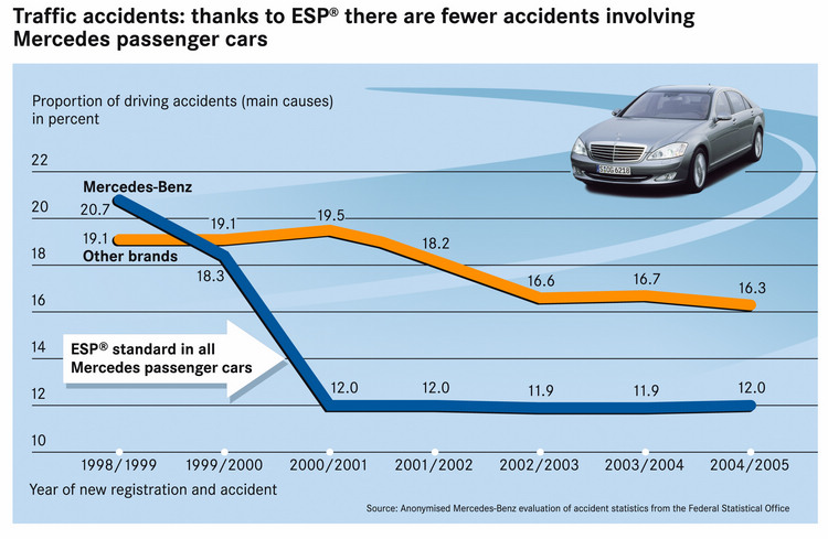 ![]() ▲足以列入汽車史的著名麋鹿測試翻車事件,導致車廠體認到主動安全系統的重要性,A-Class(W168)也順勢為全車系標配ESP。不僅於豪華車壇獨佔鰲頭,M-Benz更於安全科技獨領風騷。身為汽車安全科技的領導者,繼1978年的ABS防鎖定煞車與1985年的ASC加速防滑控制系統的率先導入使用後,M-Benz更於1995年發表ESP 電子操控系統,並導入於旗下豪華旗艦S600車型上,1997年起,從A-Class車系開始成為旗下各車種之標準配備,以尖端科技引領汽車主動安全科技趨勢,並成為後續眾多汽車品牌競相投入研發導入的濫觴。 以全方位守護的安全思維執全球汽車科技領域牛耳,M-Benz立基於ESP 的成功基礎與經驗,於今日打造Intelligent Drive智慧駕駛輔助套件,大幅提高行車主動安全層次,朝向零事故駕駛願景邁進。 ![]() ▲統計證明,在ESP尚未強制搭載的年代,自1999年起全車系標配ESP的M-Benz車輛,發生事故的案件明顯低於其他車廠的車型,類似的統計報告最終也導致歐美先進國家陸續強制要求車廠必須安裝ESP。