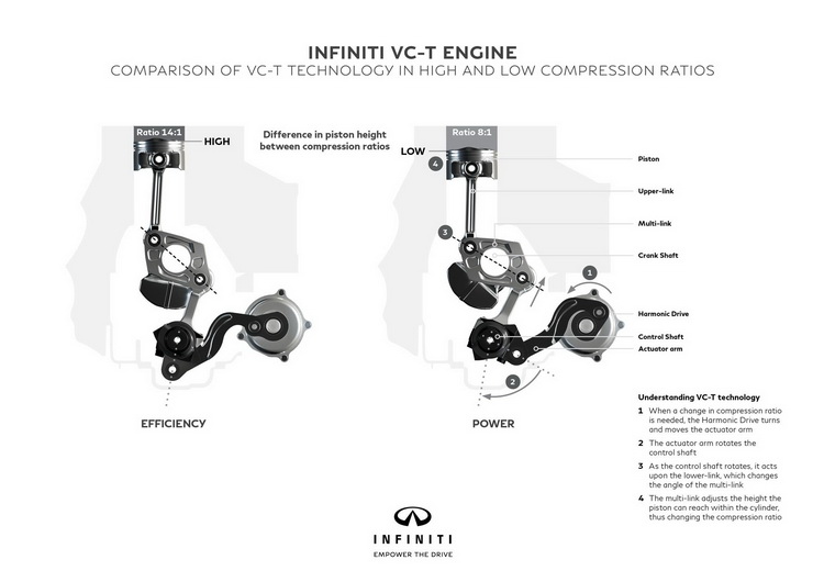 ![]() 這具車廠稱為VC-T(Variable Compression-Turbocharged)的次世代引擎將於九月份巴黎車展上正式公開。其最大的特徵就是在車輛行駛狀態下,引擎的壓縮比可以變化,這項技術將先導入於INFINITI次世代2.0升直列四缸汽油渦輪引擎。