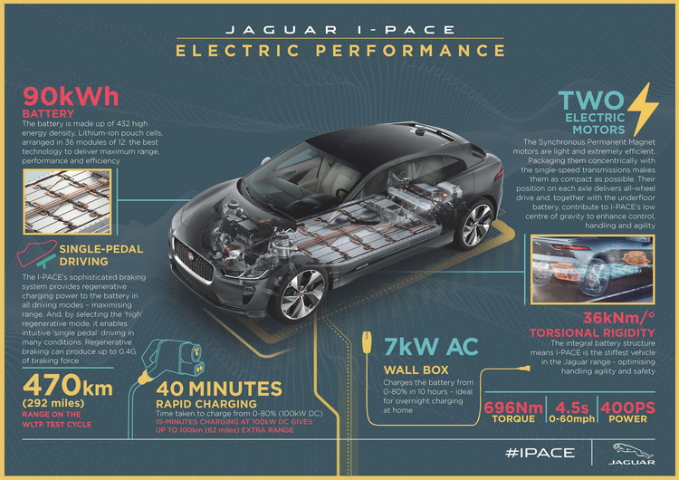 I-Pace搭載蓄電容量90kWh的鋰電池,擁有單次充飽電最多470公里的續航能力。更新後可有效提升電池工作效率 (雖然在規格認證上仍維持原本的數據),讓車子在實際道路行駛(而非實驗室測試值)之下續航里程最多增加20公里。系統對於續航里程(尚可行駛里程)的計算也更為精確線性。